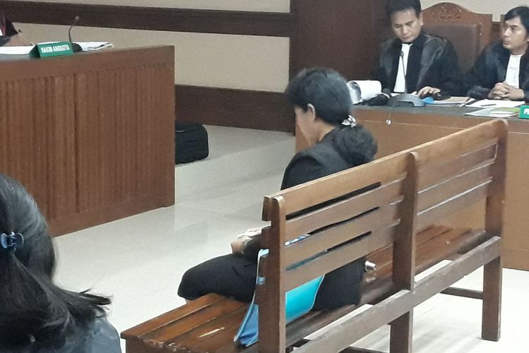Merry tampak duduk terdiam menunggu jadwal sidang. Dia tiba dengan mengenakan setelan blazer hitam dengan
